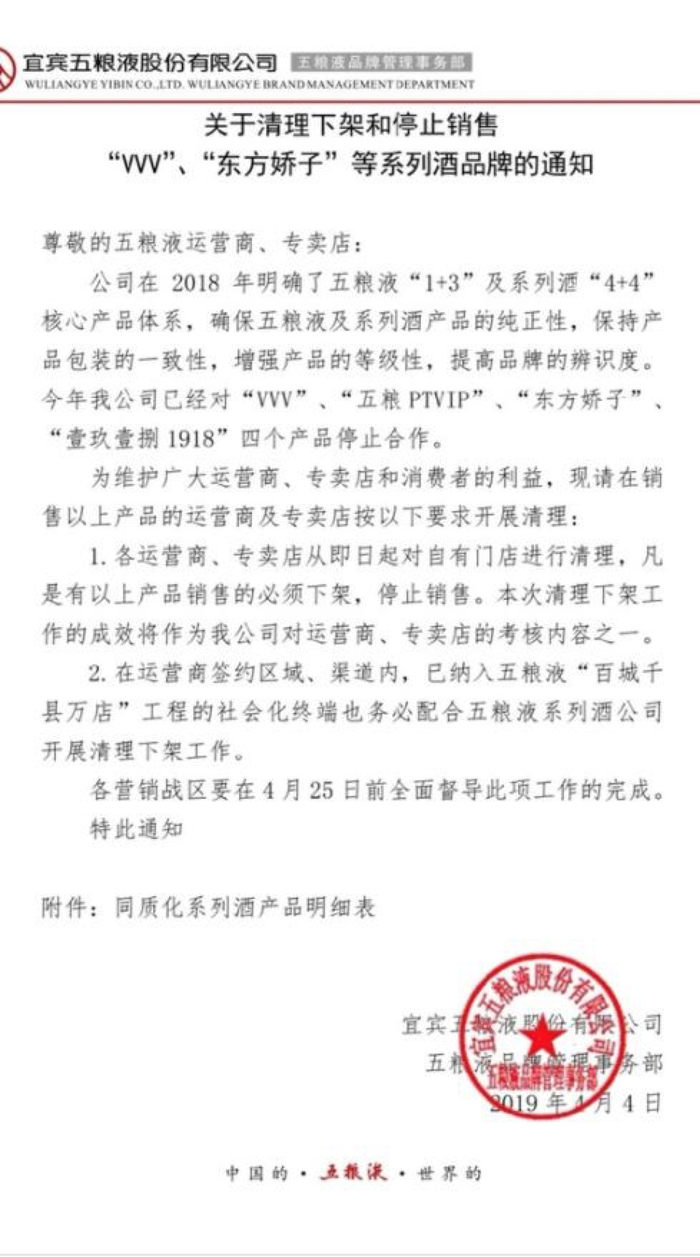 4月8日,澎湃新闻记者从五粮液方面证实,五粮液已发布《关于清理下架和停止销售“VVV”“东方娇子”等系列酒品牌的通知》,要求各运营商、专卖店停止销售“VVV”、“五粮PTVIP”、“东方娇子”和“壹玖壹捌1918”等4个品牌及其旗下的22款产品。