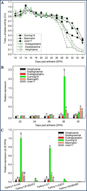 左图A:水稻、小麦、大麦、短柄草AMY1位点共线性分析(红线表示AMY1基因);B:AMY1位点结构变异示意图。右图A:种子发育过程中α-淀粉酶活性动态变化;B:种子发育中、后期AMY1基因相对表达量;C:开花后28天AMY1各亚组相对表达量(Guinong19, Mianmai43, Jinan17为成熟籽粒中高残留α-淀粉酶活性小麦品种,Honghuamai, Siqiangxiaomai, Guangguangtou为极低残留α-淀粉酶活性小麦地方品种)。