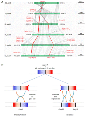 研究人员进一步对等电点α-淀粉酶(AMY1)家族进行了深入研究。AMY1是籽粒发芽期间丰度最高的淀粉水解酶,穗发芽和小麦迟熟α-淀粉酶均与AMY1的差异积累有关。通过利用已公布的禾本科基因组数据,系统评估了小麦、大麦等13种禾本科植物AMY1基因拷贝数,鉴定到小麦族分枝特有的一次基因复制事件,发现染色体片段倒位与重排将该结构位点分割为物理上相对独立的两个基因座位(AMY1λ和AMY1θ)。其中,AMY1λ中氨基酸残基Asn233受到强烈的选择,可能会影响重要功能性结构域SBS1与底物分子的识别与结合。在籽粒发芽和发育期间,AMY1λ和AMY1θ基因表达分化显著,存在剂量效应。重要的是,鉴定到小麦中与迟熟籽粒高残留α-淀粉酶活性紧密关联的3个AMY1拷贝,为下一步发掘优良等位变异,解析影响籽粒α-淀粉酶活性的遗传因子和调控机制奠定理论基础。