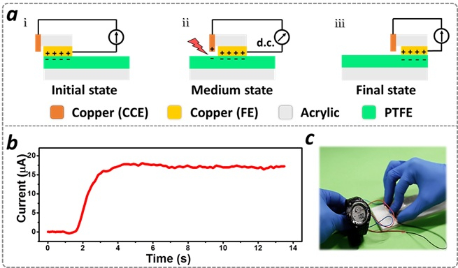 图:(a)恒流摩擦纳米发电机的工作原理,(b) 该TENG的恒电流输出,(c) 该TENG直接驱动电子手表(无整流和储能单元)。