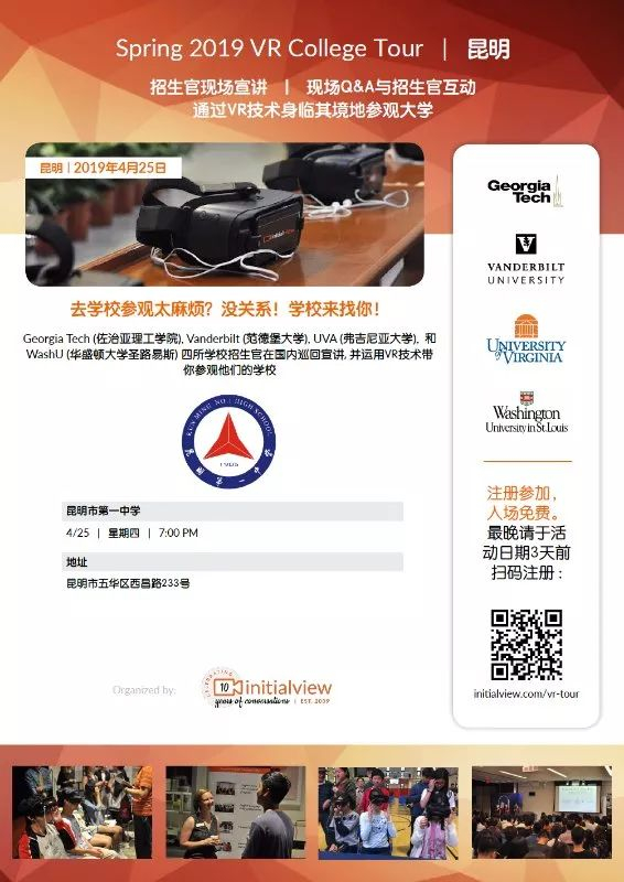 2019年4月25日(星期四)晚上七点,四所美国排名前30的综合类顶尖院校--佐治亚理工学院Georgia Institute of Technology、范德堡大学Vanderbilt University、弗吉尼亚大学University of Virginia(2019届录取学生:杨玉玺)、华盛顿大学-圣路易斯Washington University St. Louis 将首次抵达昆明,与昆明学子进行互动.此次招生说明会你将有机会通过VR技术身临其境地参观学校,请务必把握住如此难得资源和机会!