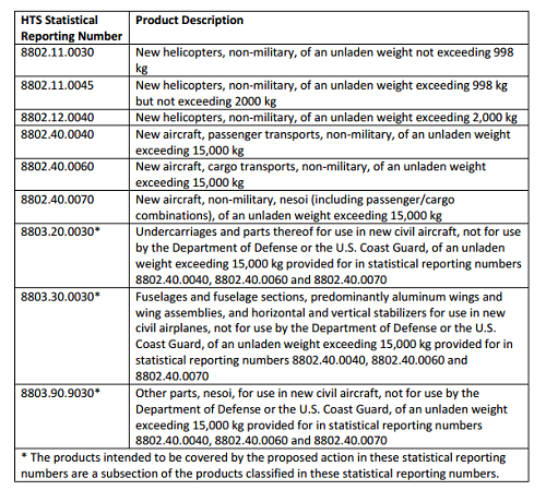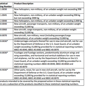 在针对法国、德国、英国和西班牙四国的第一组中,主要拟征关税的产品包括直升飞机,货运飞机,以及一些飞机零部件产品。