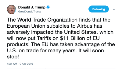 4月9日,针对美国因空客补贴案对欧盟开征110亿美元关税的威胁,欧盟在最新回应中做出三点重要表态:110亿美元的规模被严重夸大,欧盟正在等待WTO对于还击规模的仲裁以及欧方准备报复。