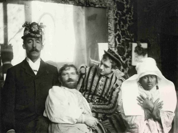 慕夏(左二)与高更(左一)等友人在巴黎大茅舍大街的工作室