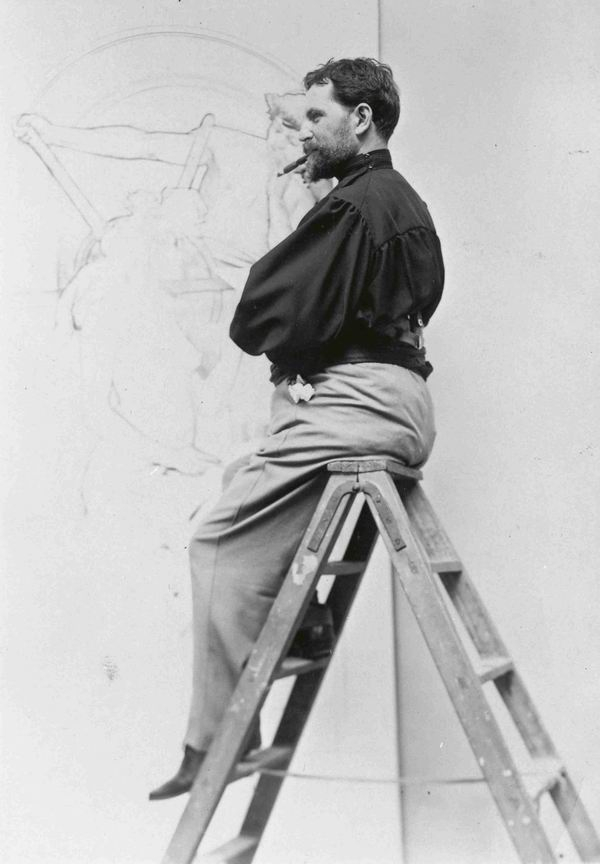 慕夏坐在梯子上为Cassan Fils印刷厂创作海报