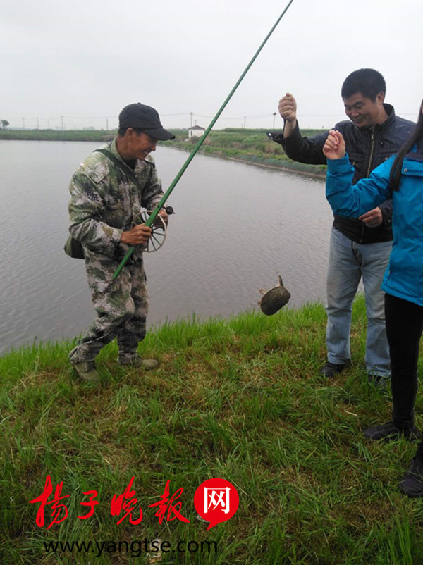 正说着,有甲鱼冒头了,黄仁平一枪下去40多米远,一只甲鱼真的上钩了,几个回合下来,这只野生甲鱼乖乖就范,后来一秤,有1.6斤,黄仁平说,这几天气温高低不定,还没到打甲鱼的高峰季节,他说,最多一天曾经打到10多公斤甲鱼,近四十年下来,至少也有上万只甲鱼成了自己的战利品,可是有的时候也会空手而归的。