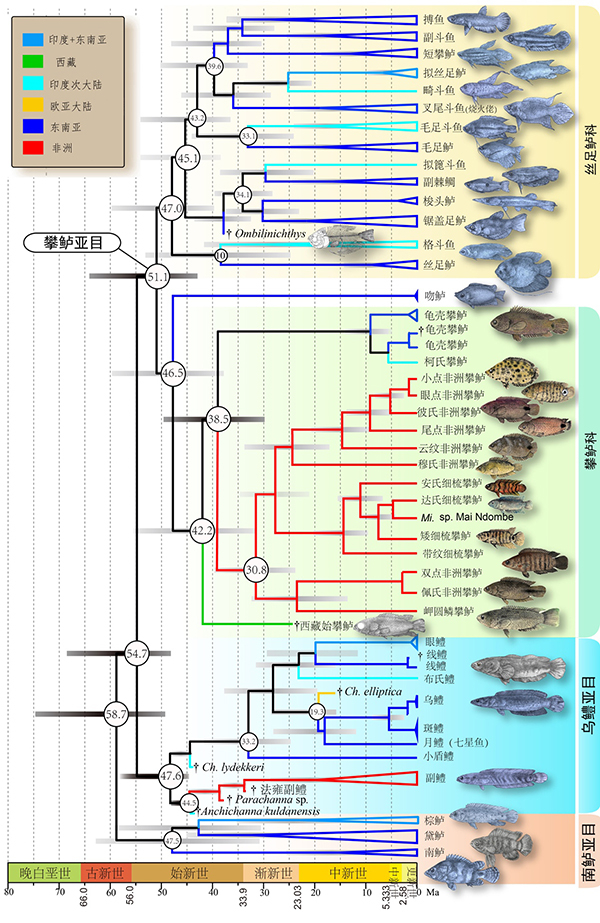 迷鳃鱼类多数种类现在分布在印度和东南亚的热带平原地区,只有攀鲈类还分布在撒哈拉以南非洲中西部的热带平原和雨林地区。这样一个特殊的间断分布模式是冈瓦纳裂解、印度板块漂移隔离分化的产物?还是新近纪大陆间扩散事件的结果?或者由其他原因造就?前人曾尝试分子学分析解疑,但由于缺乏较可靠的化石记录,一直没有清晰的答案。