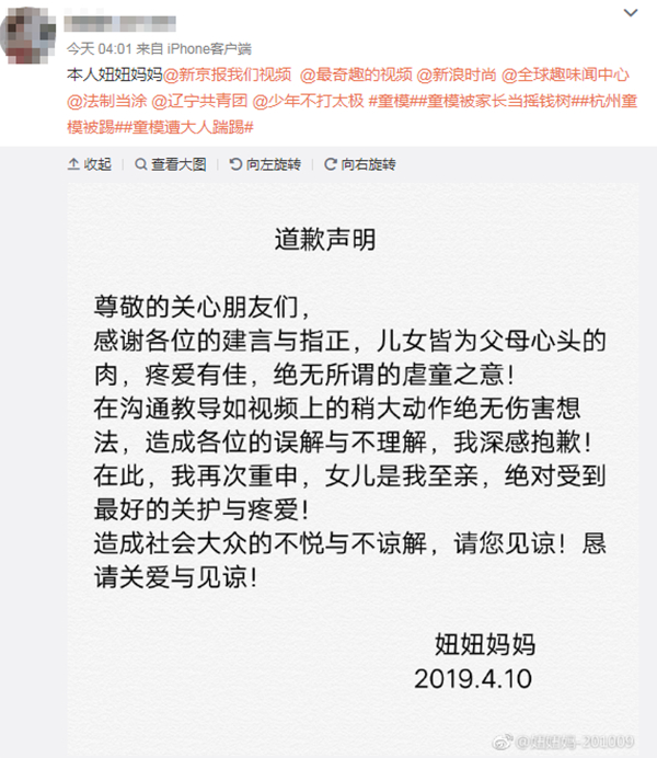 4月10日,有自称妞妞妈妈的微博用户发道歉声明称,其绝无虐童之意,“在沟通教导如视频上的稍大动作绝无伤害想法,造成各位的误解与不理解,我深感抱歉。”