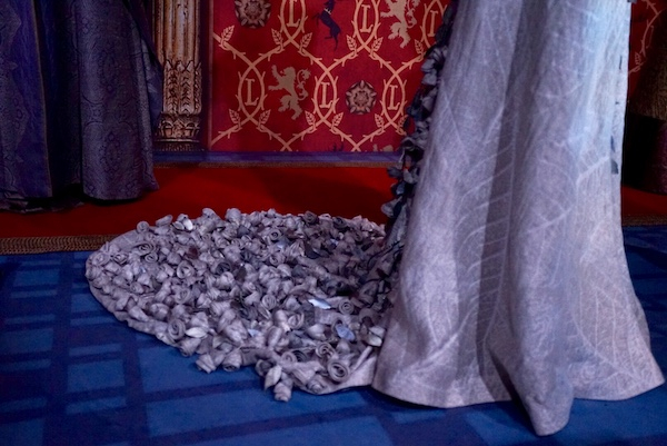 米凯莱·克莱普顿的巧手设计,让服装哪怕只被角色穿过一次,也让人印象深刻,在展览中一望而知,所有故事情节随之浮现。不止是洋葱骑士,谁又能忘记小玫瑰那件拖尾缀满玫瑰的礼服?这件婚服全部由手工制作,足足花了12个星期。艾莉亚与“猎狗”的两身衣服对比强烈,一件娇小一件巨大,然而都破破烂烂,艾莉亚的裤腿上还有破洞,让人想起他们在河间地艰难的游荡生活。丹妮莉丝在奴隶湾穿的那件蓝色长袍,被六名无垢者护卫;还有琼恩·雪诺被判有罪时身着的大衣、梅丽珊卓那件永远不变的红袍……