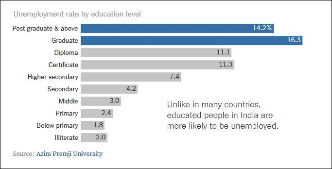 印度各教育程度(由高到低)人群的失业率 《纽约时报》截图
