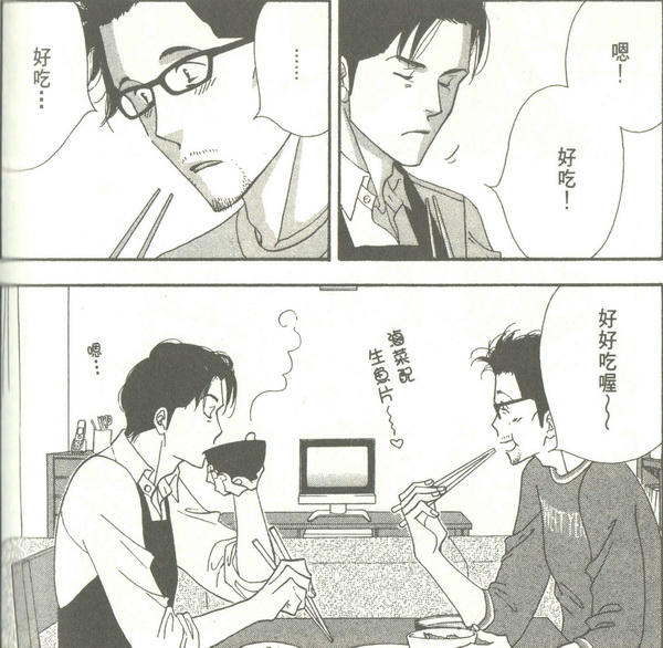 而《昨日的美食》则将吉永史一直视为萌点的大叔系(她曾在访谈中透露,虽然自己并不常看BL漫画,但专画大叔的BL漫画家西田东的作品很合她胃口)、她熟悉的法律领域以及她最爱的美食熔于一炉,也难怪一画就画了十多年。