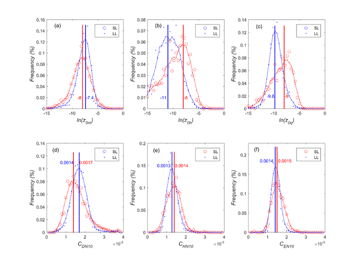 图2 纳木错大湖和小湖(a)动量粗糙度,(b)热量粗糙度,(c)水汽粗糙度,(d)动量总体输送系数,(e)热量总体输送系数,(f)水汽总体输送系数的对数统计分布图。红色代表小湖,蓝色代表大湖。