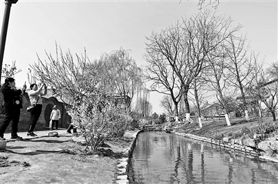 在前门东区,水穿街巷的“三里河”尤其值得一提。河岸两侧桃红柳绿,春和景明,小桥流水潺潺,杨柳迎风招摇。不少居民来这里散步,还有游客来此拍照留念。