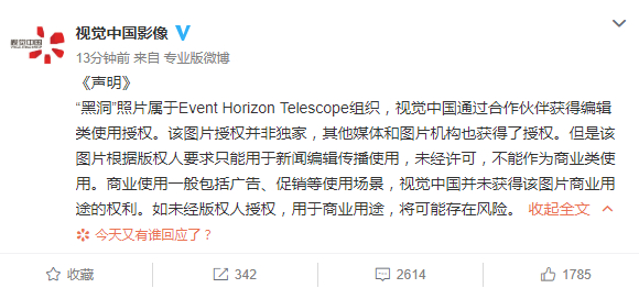 针对于视觉中国收录人类首张黑洞照片一事,视觉中国影像发布微博声明称,“黑洞”照片属于Event Horizon Telescope组织,视觉中国通过合作伙伴获得编辑类使用授权。该图片授权并非独家,其他媒体和图片机构也获得了授权。但是该图片根据版权人要求只能用于新闻编辑传播使用,未经许可,不能作为商业类使用。商业使用一般包括广告、促销等使用场景,视觉中国并未获得该图片商业用途的权利。如未经版权人授权,用于商业用途,将可能存在风险。