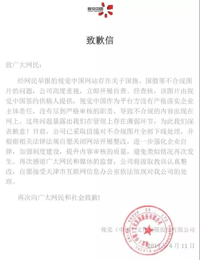 视觉中国在其官方微信发布整改通知,经网民举报的视觉中国网站存在关于国旗、国徽等不合规图片的问题,公司高度重视,立即开展自查。经查核,该图片由视觉中国签约供稿人提供,视觉中国作为平台方没有严格落实企业主体责任,没有尽到严格审核的职责,导致不合规的内容出现在网上。这些问题暴露出视觉中国在管理上存在薄弱环节,为此视觉中国深表歉意。目前,公司已采取措施对不合规图片全部下线处理,并根据相关法律法规自愿关闭网站开展整改,进一步强化企业自律,强化制度建设,提升内容审核的质量,避免类似情况再次发生。再次感谢广大网民和媒体的监督,公司将汲取教训认真整改,自愿接受天津市互联网信息办公室依法依规对本公司的处理。