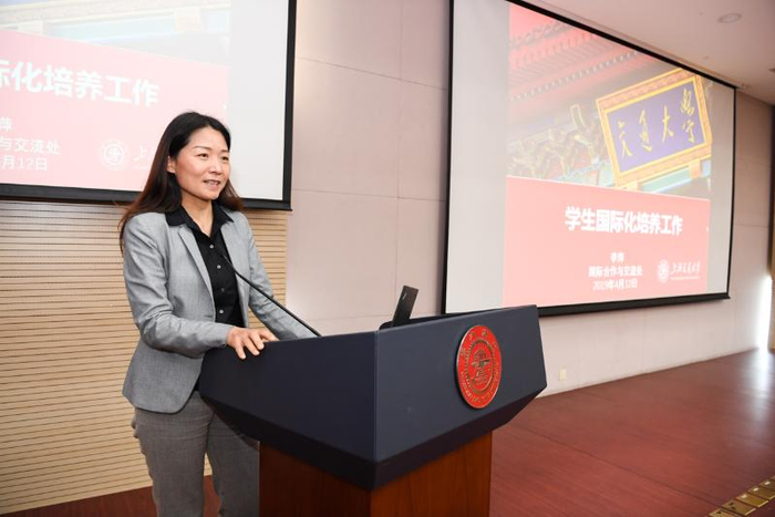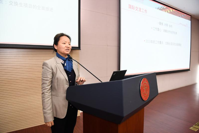 国际合作与交流处副处长郭亮,副处长兼留学生发展中心主任李萍围绕新战略实施,分别介绍对外交流的推进计划和学生交换工作的推进方案;国际合作与交流处港澳台办公室副主任姚雪介绍了学校港澳台重点工作内容,出入境管理与服务中心主任李毅介绍了学校出入境的政策现状等。