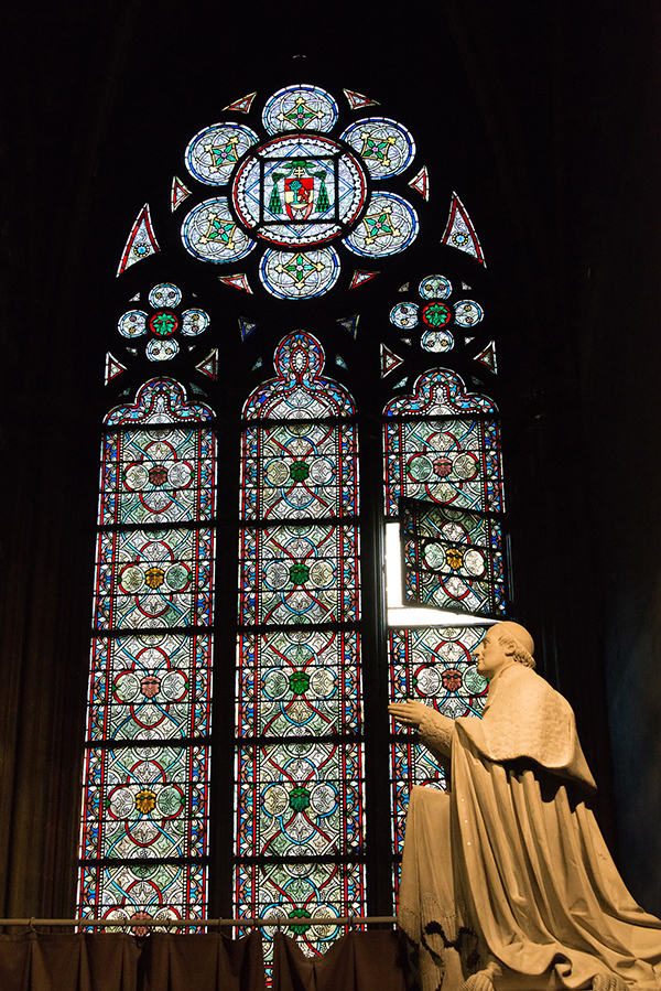 教堂拥有西、南、北三面花窗,东面原本的花窗已在18世纪的一次维修中,由于采光原因全部被替换为透明玻璃。不过,保留下的三面花窗也不尽然是中世纪的历史遗存。教堂西面的花窗在19世纪时被全部重新镶嵌,南面的花窗则命运多舛,16世纪时它经历了一次大的破坏,1830年的七月革命进一步破坏了它。1861年,欧仁·维奥莱-勒-杜克修复了这一面花窗,修复中使用了许多新玻璃,但也尽量保留了古老花窗的部分。其中一面描绘了马太福音中的圣经故事,来自12世纪末期的教堂初建之时,是大火前圣母院保存的最古老的一面花窗。1960年,19世纪时期的花窗又被新的玻璃替换。