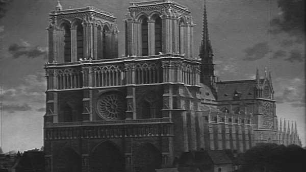 在这一版本中,艾丝美拉达为了躲避巡警队,初次踏入圣母院时,就不由赞叹起这座建筑的美妙:“光线柔和地环绕着高耸的廊柱……这里显得如此安静祥和。”不过,跟好莱坞拍摄的其他几版《巴黎圣母院》一样,由彼时的电影巨头雷电华出品的这部影片,也并非在巴黎实地取材,而是在洛杉矶的片场拍摄。不过,庞大的搭景规模以及奢华细致的内部布置在当时确属首屈一指,负责外部建筑的Van Nest Polglase(《公民凯恩》《吉尔达》)和内部设计的Darrell Silvera(《美人计》《育婴奇谭》)都非泛泛之辈,极大程度还原了圣母院的真实景象。这一点从影片尾声中,镜头从钟楼雕塑和卡西莫多的近景推至圣母院的全景画面中,最能见真章。