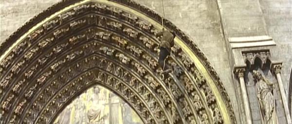 虽然这一版《巴黎圣母院》确实是在法国拍摄,但从画面上一眼就能看出搭景的痕迹,是否曾在圣母院实地取景值得商榷。不过,姑且不论是否有实景画面,从卡西莫多跳下钟楼的露台,攀附着以怪兽头像装饰的排水口,为艾丝美拉达摘下一朵生长在镂空的外墙上的小白花的画面中,圣母院的精雕细琢尽显无疑。