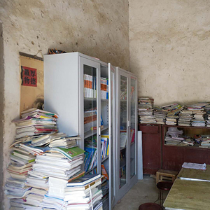 这个临时收拾出的“图书室”,室内是斑驳的土墙和泥土地,一些手写的诗词贴在墙上,就是成为了图书室唯一的装饰。一百多册图书和杂志,整齐摆放在靠墙的木桌上,虽然图书破旧、发黄,但还是吸引了许多周边的孩子。