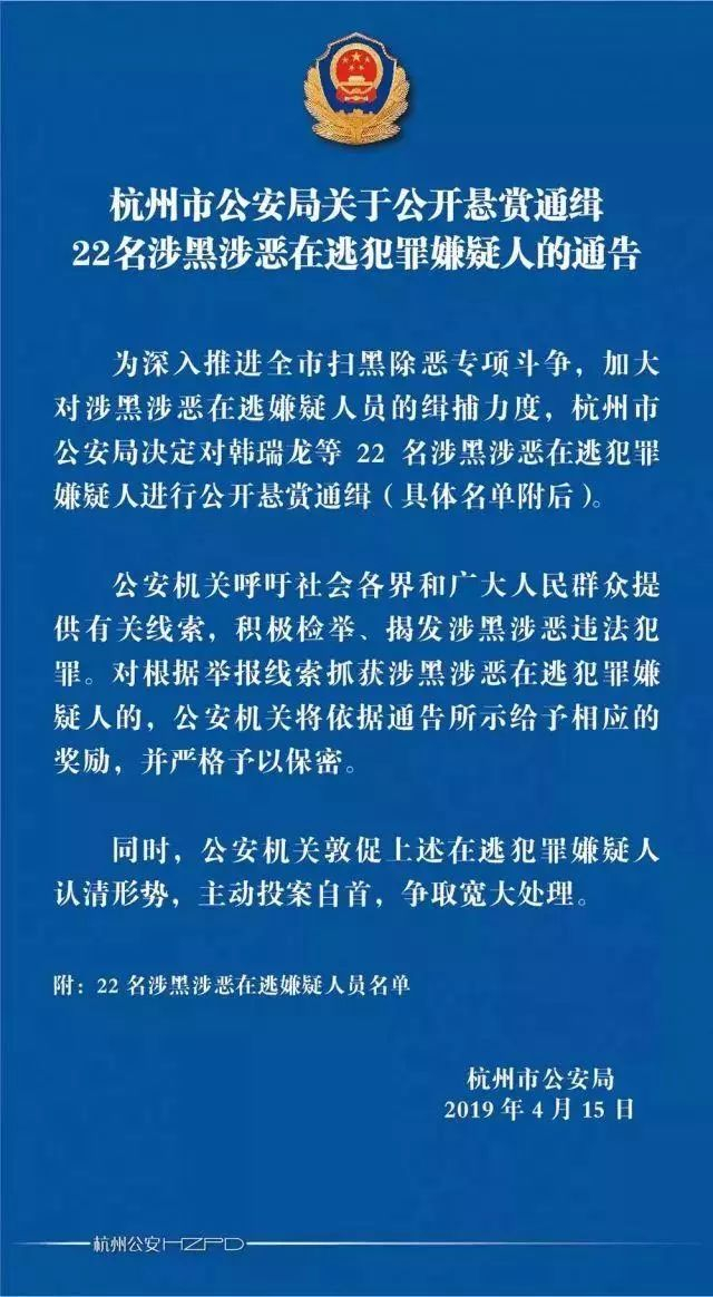 注意丨杭州警方公开悬赏通缉22名涉黑涉恶在逃嫌疑人 中国搜索 中国搜索(chinaso.com)官方账号 2019.04.1710:28 关注 原标题:注意丨杭州警方公开悬赏通缉22名涉黑涉恶在逃嫌疑人 特别推荐 奔驰母公司遭调查巴黎圣母院火灾后故宫紧急开会 49年0火灾秘籍了解一下!来源:杭州日报编辑:徐骁骁