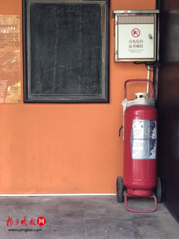 上午10点半,扬子晚报记者跟随南京市消防救援支队秦淮大队的张晟途大队长和秦淮大队消防监督员宗妍,走进位于夫子庙景区的大成殿内。大成殿地处秦淮风光带的核心区,为南京夫子庙的主殿,高16.22米、深21.7米,是一座重檐歇山顶的建筑,屋脊的双龙戏珠立雕,号称“江南第一龙”,整座建筑重檐飞翘,斗拱交错,气势雄伟。进入大殿的入口处,可以看见一个明显的“打火机存放处”标牌,提示景区内禁止吸烟,工作人员告诉记者,前来观光的游客防火意识已逐步增强,能够积极配合禁烟措施,会主动将打火机放入存放处。大门正中位置的消防火眼系统,可监控游烟,监测到险情通知微型消防站,殿前的香炉旁和台阶处放有灭火器和灭火毯,屋檐下设置了半固定水幕,在不破坏古建筑结构的基础上既保障了灭火的及时性,更兼具传统美观的效果。走进“东南第一学堂”大门右侧,还可以看见景区设置的微型消防站,能够保障火灾发生时,工作人员能第一时间采取灭火行动,控制火情,为消防救援争取时间。