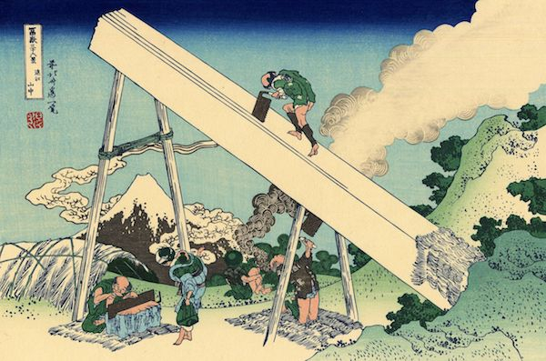 北斋的富士山画作常常省略中景,在远景与近景的对比中产生独特的纵深感。采用西洋的透视画法、强调画面纵深感的绘画技巧,在18世纪中期已经被引入浮世绘创作中,并因景物宛如“浮现”在纸面上一般而又被称为“浮绘”。还在名为“胜川春朗”的青年时代时,北斋就已经运用“浮绘”技巧创作了以浅草寺、两国桥等江户名胜为题材的风景画,他描绘富士山时采用的空间表现技巧正是在过去的钻研和实践中积累而成的。北斋常常在画作近处安排较大的物体,与远处的富士山构成远近对比,被省略的中景则令人感受到空间的广阔。如“尾州不二见原”中,近处画有巨大的木桶,富士山被画在木桶的圆形轮廓之中,观赏者仿佛透过望远镜窥视富士山一般。“远江山中”则在画面对角线上画有巨大木材,人们从支柱的空隙见眺望富士山,可谓是非常奇特的视角。构成三角形的支柱与富士山形状上的相似性也值得注目。