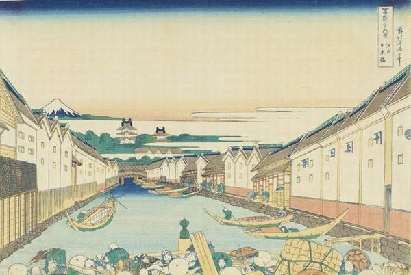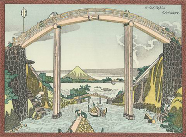 从桥下眺望富士山的奇特构图,始见于河村岷雪的《百富士》,北斋也在文化年间(1804-1818)创作有西洋式风景版画《高桥富士》,但画面中桥的位置过高,未能表现出恰当的纵深感。经过这类尝试后,北斋终于创作出了“深川万年桥下”一般稳定构图与奇特视角共存的作品。该画描绘了横跨隅田川支流小名木川的万年桥的侧面,用对称线条绘制的桥梁构图富于几何学特征,又采用了西洋透视画法,从桥下的小舟中远眺富士山,呈现出北斋的独特个性。