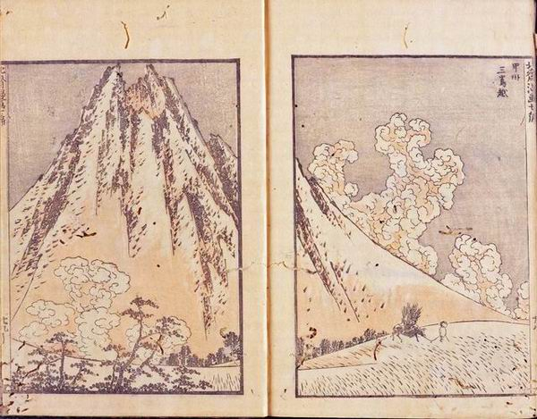 北斋一直对富士山抱有强烈的兴趣,描绘各种各样的富士山姿态可谓是贯彻他艺术生命的一条重要线索。他之所以痴迷于富士山,河村岷雪于明和八年(1771)出版的画集《百富士》的影响不容忽略,同时江户时期百姓中流行的祭祀、攀登并参拜富士山的“富士讲”也是重要的风俗背景。