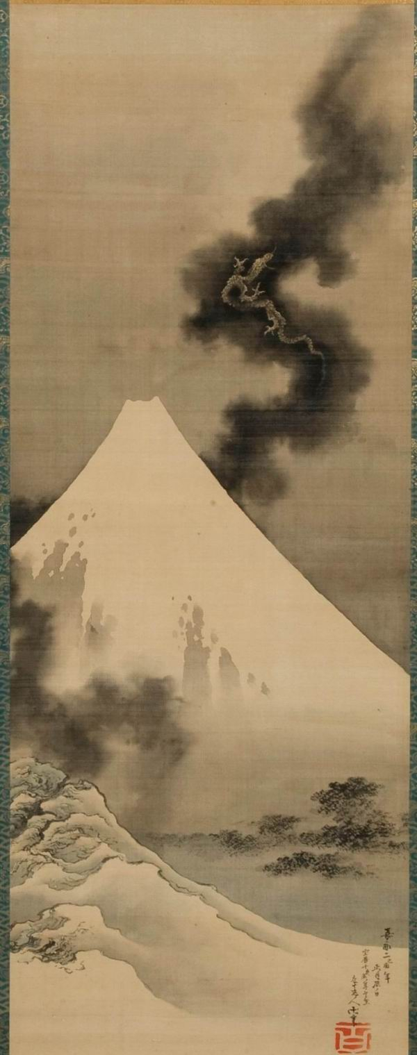 在《富岳三十六景》、《富士百景》之外,《阿兰陀画镜江户八景骏河町》、《东海道五十三次之内》等锦绘组画、《柳丝》、《山满多山》等狂歌画册中也时常可见耸立在地平线上或是建筑物对面的富士山。北斋的肉笔画《富士越龙图》是值得注目的晚年作品,据落款可知此画作于北斋逝世前约三个月时,几乎是他的绝笔之作。北斋在人生的最后时刻也执着于“富士山”这一主题,画中雄浑的富士山形象凝聚了北斋一生的艺术追求,而那飞越富士山、与黑云一道直冲天际的巨龙,或许同北斋自身也有重合之处。