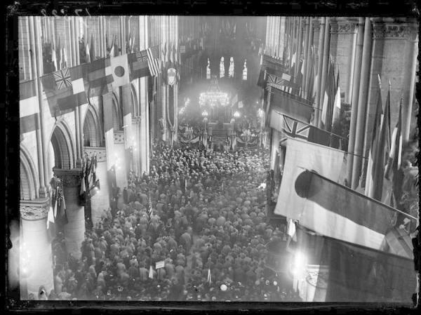 占领时期的至暗时刻:贝当元帅在1944年4月在巴黎人的欢呼声中受到红衣主教苏哈德庄严地接待。光明时刻到来,巴黎解放从在教堂前的广场开始,1944年8月24日,德罗纳上尉的装甲车在一群西班牙共和党人的簇拥下,先是占领了警察局总部,随后是几步开外的市政厅,而这场起义最后的高潮,就是戴高乐将军与“自由法国”和抵抗运动的领导人一起来到大教堂内,在管风琴伴奏下一起高唱《赞美颂》与《马赛曲》。据记载,就在他们进入教堂的那一刻,屋顶上还有狙击手伏击下面的人群,而戴高乐将军仍保持挺立姿势,沉稳缓慢地步入正殿。