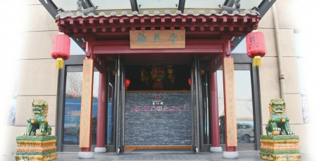 晋门醉非遗文化体验基地正门:国家级非遗苏式琉璃狮、省级非遗平遥彩灯、省级非遗稷山木雕刻联。