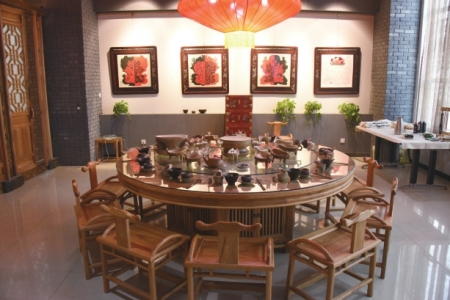 晋门醉非遗文化体验基地非遗主题包间(国家级非遗平定砂器烧制技艺制作的砂器餐具、国家级非遗平遥推光漆髹饰技艺制作的大漆柜、世界非遗山西剪纸、省级非遗平遥彩灯、非遗桌椅)。