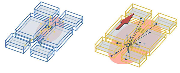空间改造的使用情况分析。阶段一:座椅使用者的居住空间分布(左图),阶段二:座椅+雨棚 使用者的居住空间分布(右图)。