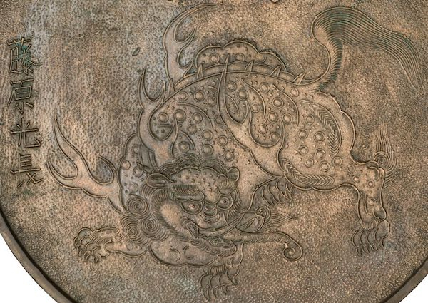 此镜中的貘满身火焰,增添了神秘感。室町时期以前主要是用貘形枕头,或是在枕头上绣以貘的图案,直到室町之后才在镜纹中出现。