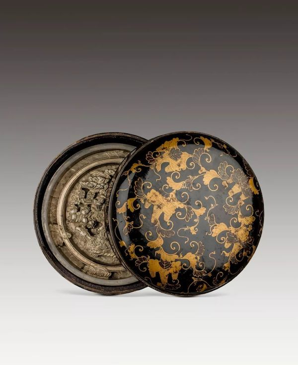 此镜盒表面有双蝶纹样,此纹样应为日本的家族族徽纹章。族徽多为表示祥瑞的动植物图案。日本的“平” 氏的家纹即为蝶纹。族徽是血统出身的标志,可以说是“画成图案的姓氏”