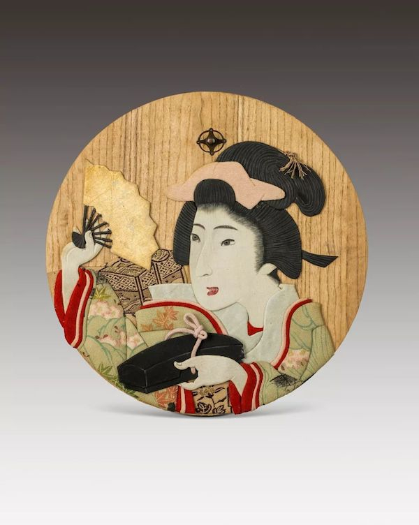 根据镜盒、镜覆可知,此镜制作完成后,几乎未经实际使用,较好地保存了原貌。镜盒内的镜覆有浮世绘风格。“浮世”源自佛教用语,本意指人的生死轮回等人间世事,后指现世和世俗。日本浮世绘是以江户时代(公元1603~1867年)的市民阶层为基础而发展起来的风俗画。此“镜覆”题材属“美人绘”,女子形象富于韵味,面容平静,用色雅致。此镜覆既不是版画,也不是手绘,而是主要用布料制成,辅以绘画。