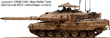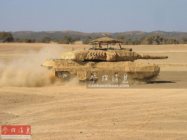 除美军外,加拿大陆军也为部署到阿富汗的“豹2”A6M坦克部队配备了“战术阳伞”系统以及“梭鱼”披挂式红外伪装系统。图为驻阿富汗的加拿大陆军“豹2”A6M坦克,也配备了“战术阳伞”系统。