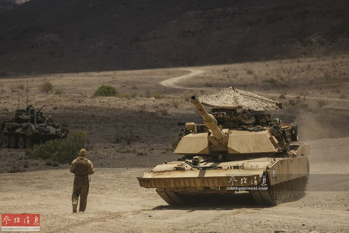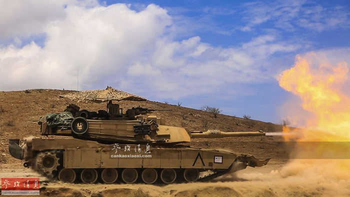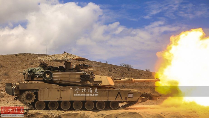 搭载有“战术阳伞”美海军陆战队M1A1坦克开火瞬间之二。