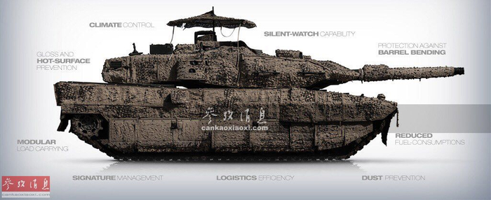 据宣传图显示,这种“梭鱼”披挂式红外伪装系统与“战术阳伞”相结合,也具备多种功能,例如能降低坦克的红外信号特征、防尘、降低燃油消耗、降温等,单就宣传来看也是十分先进。