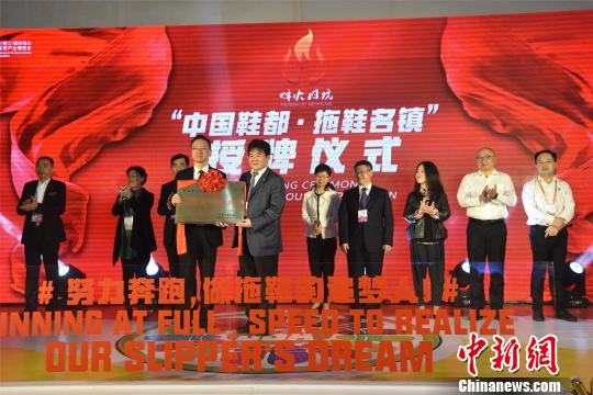 中新网晋江4月20日电 (陈龙山)在正于福建晋江举行的第二十一届中国(晋江)国际鞋业暨第四届国际体育产业博览会上,“中国鞋都”晋江的内坑镇获授予“中国鞋都·拖鞋名镇”牌匾。