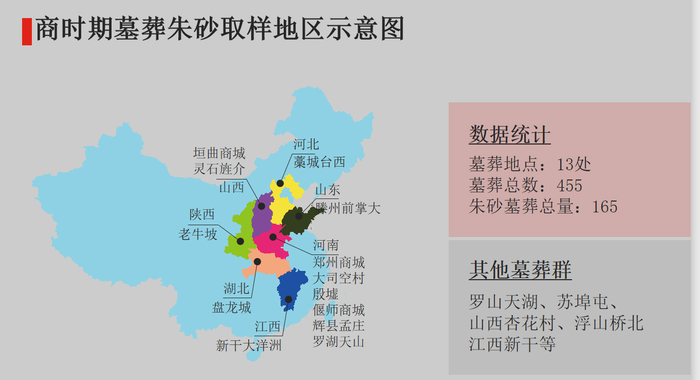 西北大学张煜珧同学对300多座有朱砂的商周墓葬进行统计学分析,结果表明朱砂在商周时期较高等级墓葬内使用,是墓主身份地位的象征。但是朱砂产地不在商周王朝所处的中原以及北方地区,而是在湘、川、桂、黔等西南地区,当时是作为贡品被奉献到北方的,史料记载商王和甲曾发动西征,得到朱砂矿一座,可见商王朝为得到朱砂不惜诉诸武力。而青铜器铭文表明,周王曾到庚嬴的住宅,赏赐她十朋海贝、一管朱砂。诸多现象表明,商周贵族使用的朱砂主要来自天子的封赏赐赠,这是国家意志和王朝尊严的政治表征。进入春秋,朱砂墓急剧减少,可能是因为王室地位下降,国家控制社会资源的能力丧失,战国以后,因为战争使得流通不畅,加之水银提炼和使用开始大范围推广,让这一颇具特色的朱砂葬仪传统消失在历史烟云中。
