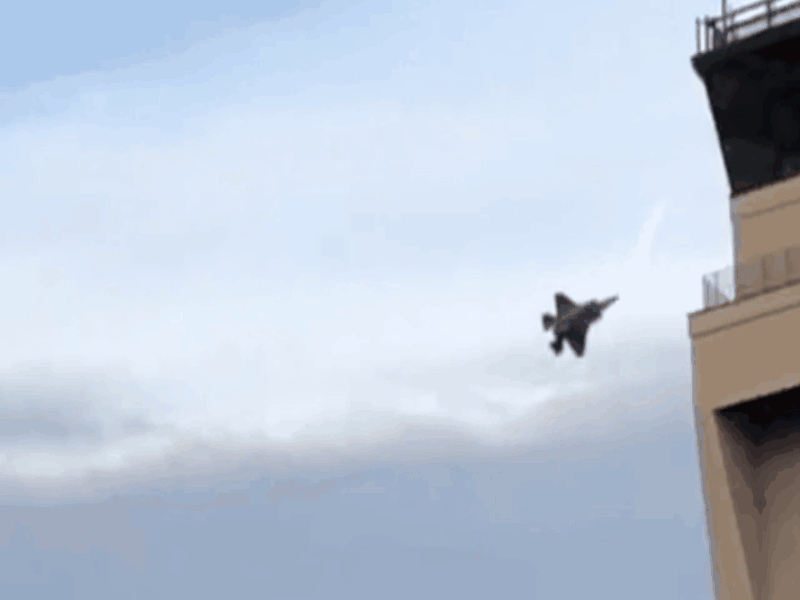 此外该型战机还表演了大迎角慢速爬升以及“低空大迎角慢速通场”等高难机动动作,充分展示了F-35A的先进飞控系统,以及普惠F135涡扇发动机的优秀性能。图为F-35A表演低空大迎角慢速通场动态图。