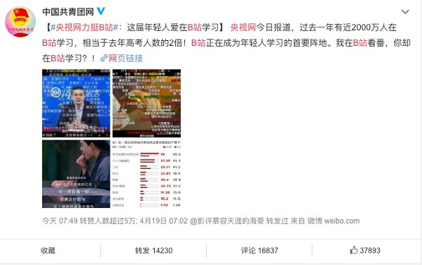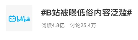 接着微博接连出现两个阅读量过亿的热搜:#B站被曝低俗内容泛滥#和#央视网力挺B站#,前者被大量娱乐号发布,而后者得到共青团网支持。