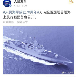 根据观察者网此前的报道,055型驱逐舰首舰在3月30日从江南造船厂出发,用平均17节航速航行1天又17个小时以后抵达青岛古镇口军港,这或许是为了4月份的国际海上阅兵做准备。