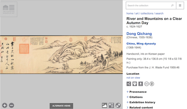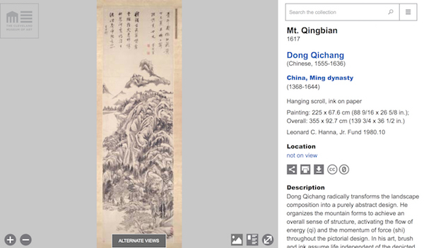 近期,围绕“视觉中国”图片使用权的新闻再次引起人们对图片版权的关注。近期,美国克利夫兰艺术博物馆(CMA)宣布,开放馆藏3万件公共领域艺术品的数字版权。此外,公开超过6.1万件作品的资料。澎湃新闻了解到,克里夫兰艺术博物馆最著名的中国书画藏品当属董其昌以王蒙《青卞隐居图》为母题所作的巨幅山水画《青卞图》(此前曾在上海博物馆展出)。