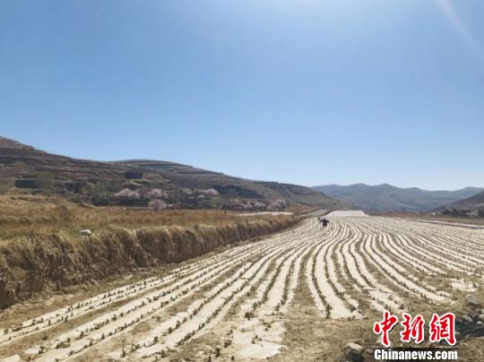 甘肃定西市渭源县秦祁乡属于黄土梁峁沟壑干旱区,当地传统农作物是土豆和大豆。图为当地农民的覆膜农作物。 闫姣 摄