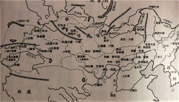 除了内属旗和扎萨克旗以外,还有一类介于二者之间,察哈尔部就被编成了这样一类旗。它在政治上有内属的意义,但在法律上又有外藩的属性。起初,清廷把察哈尔部分成两部分,既建立了察哈尔扎萨克旗,又建立了察哈尔八旗,给他们分别划定了各自的范围,且规定只能在各自范围内活动。其中的扎萨克旗,是由前察哈尔本部头目林丹汗的后裔来领旗。林丹汗是达延汗的后裔,而达延汗是成吉思汗的后裔。因此从世系上来说,林丹汗以蒙古大汗的直系自居。但这一部分,因为发动了对清朝的叛乱,在康熙十四年(1675)后被撤掉了,从此这一支的传承就断了。另外一部分察哈尔八旗,分成左翼和右翼各四旗,左翼的一部分挪到了直隶的口外,就是现在河北省的北边。右翼的一部分挪到了山西的口外,就是现在山西省的北边。