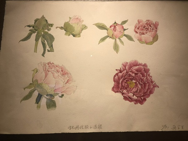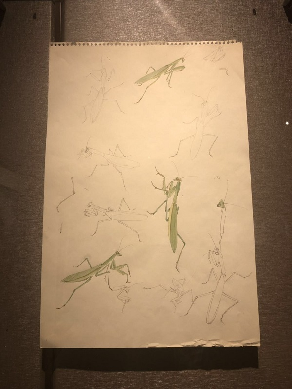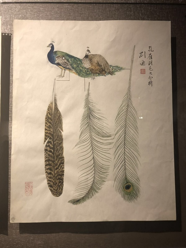 刘墉非常注重写生。他为自己总结的画花鸟四法第一法就是要“观物精微”。他画动植物就像一位苛刻的自然学家,不仅仅是整体写生,还总是把花切开,看花瓣的规则、花蕊的数目、子房的位置,并作翔实的记录。画鸟为了了解羽毛结构,把各种鸟翅膀拉开来一根根记录,还要画出鸟的骨骼,计算鸟的飞羽数目。画螳螂就观察螳螂交配,记录下母螳螂在交配时吃公螳螂的每个阶段,精确计算到每分每秒。此次展览也展出了不少写生研究稿。