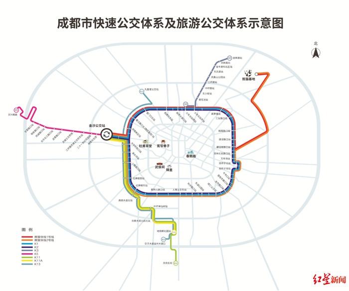 两条线路经二环高架南北半环全覆盖二环高架公交站点,驶离二环路高架后直达熊猫基地,即市民只需在二环快速公交任意一个站点都可以直达熊猫基地。同时,由熊猫基地返回乘坐熊猫快线,可免费换乘途经二环高架快速公交线路K1、K2、K11、K13线路。